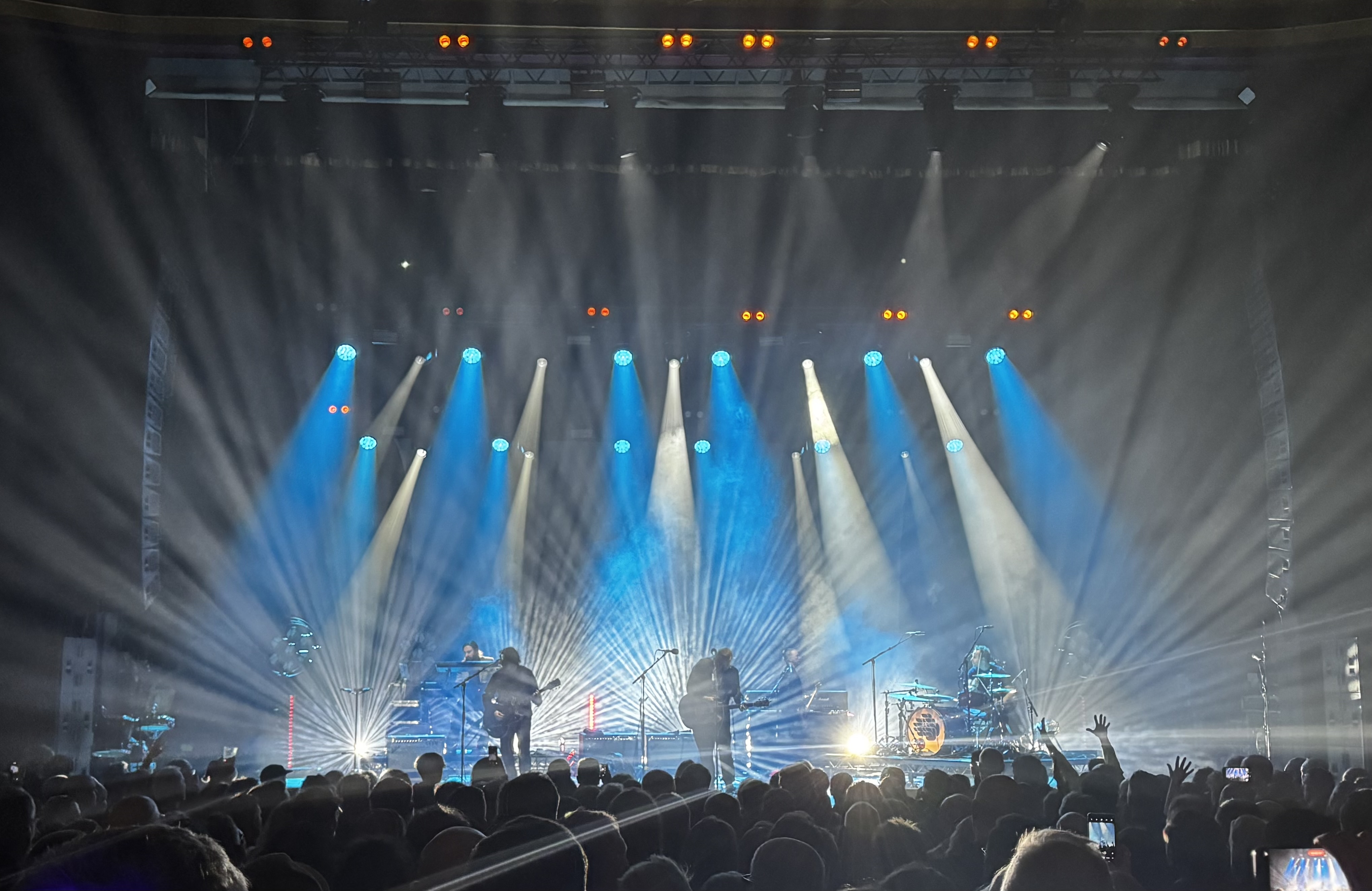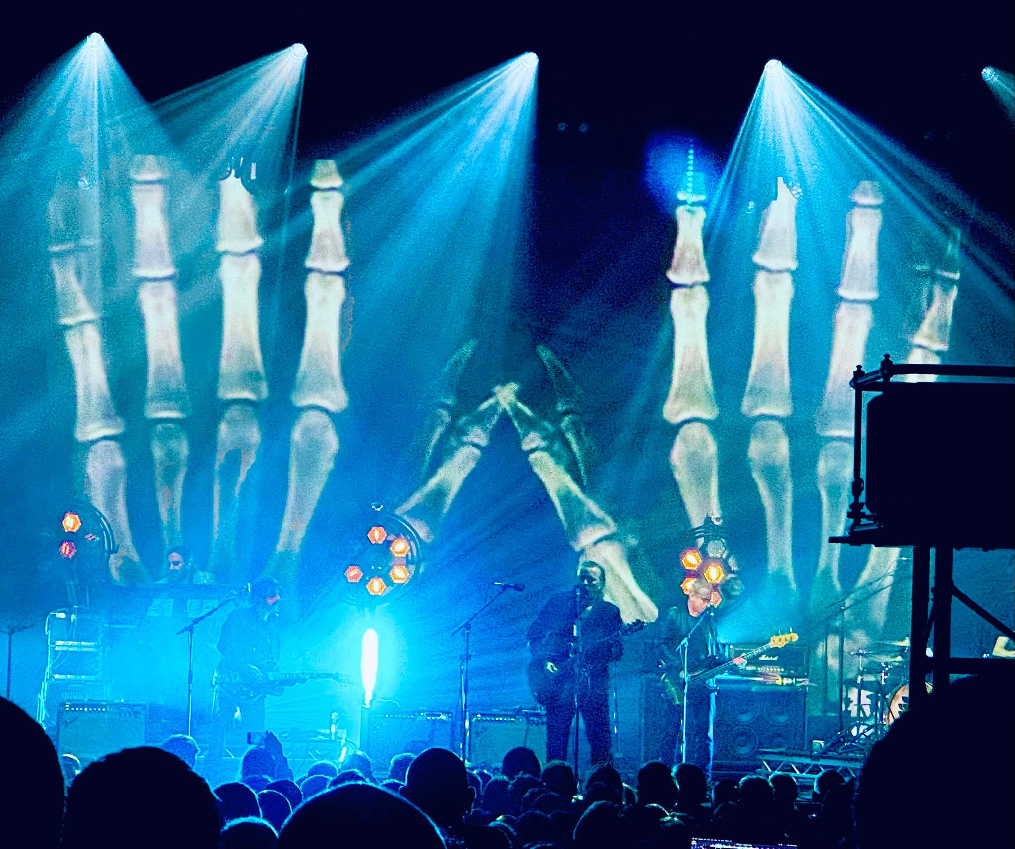 video content is sent from FOH via projector that is focused to throw the content across the band and then finally onto a white rear scrim